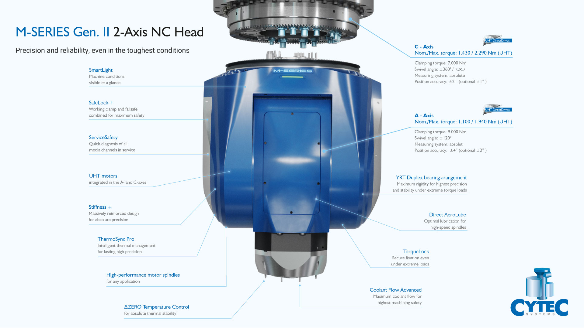 CYTEC hebt mit dem neuen Gabelfräskopf die Messlatte in der 5-Achsenbearbeitung. Die M-SERIE bietet höchste Drehmomente, Steifigkeit und Präzision – selbst bei härtesten Bedingungen.